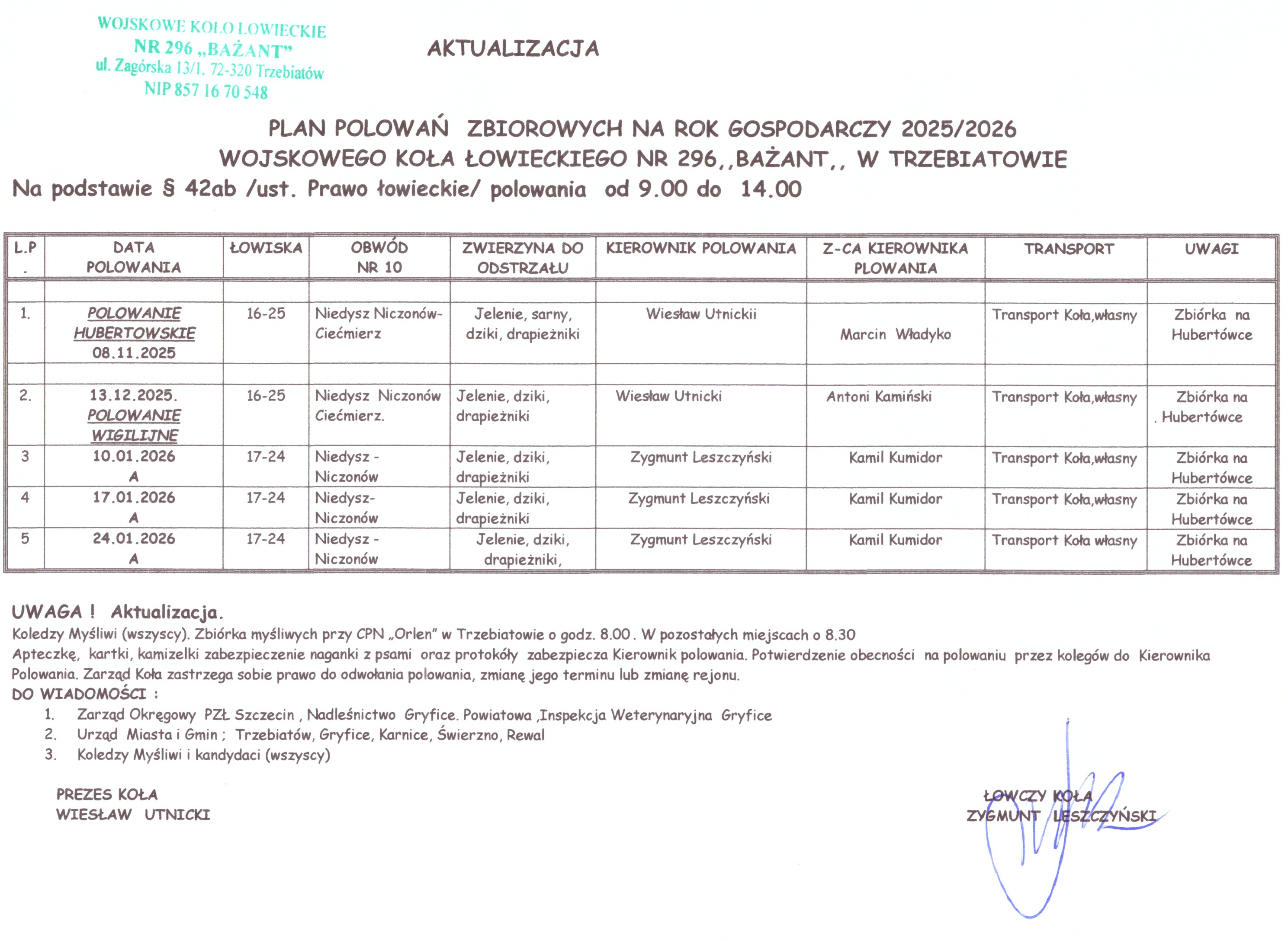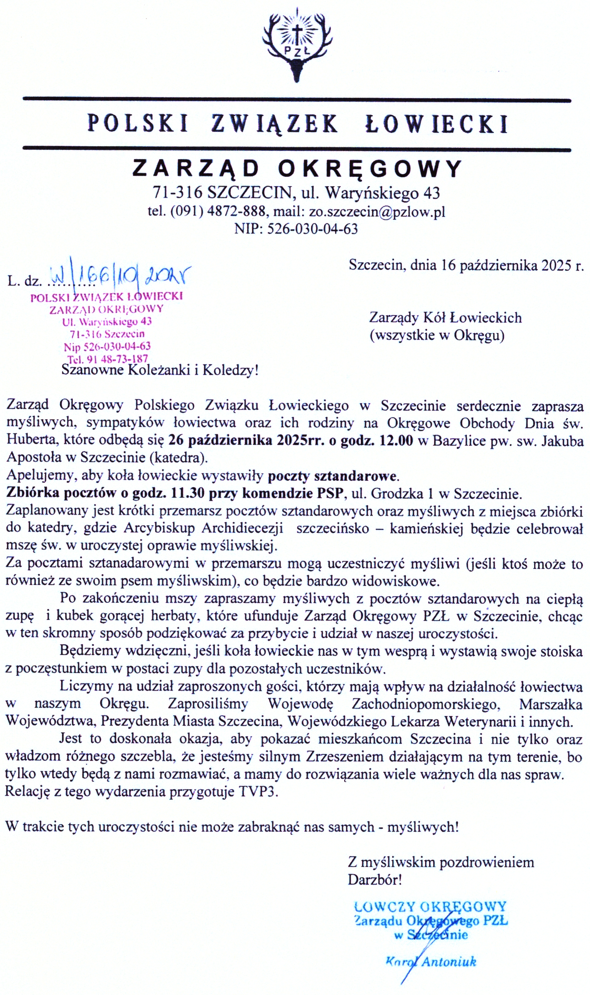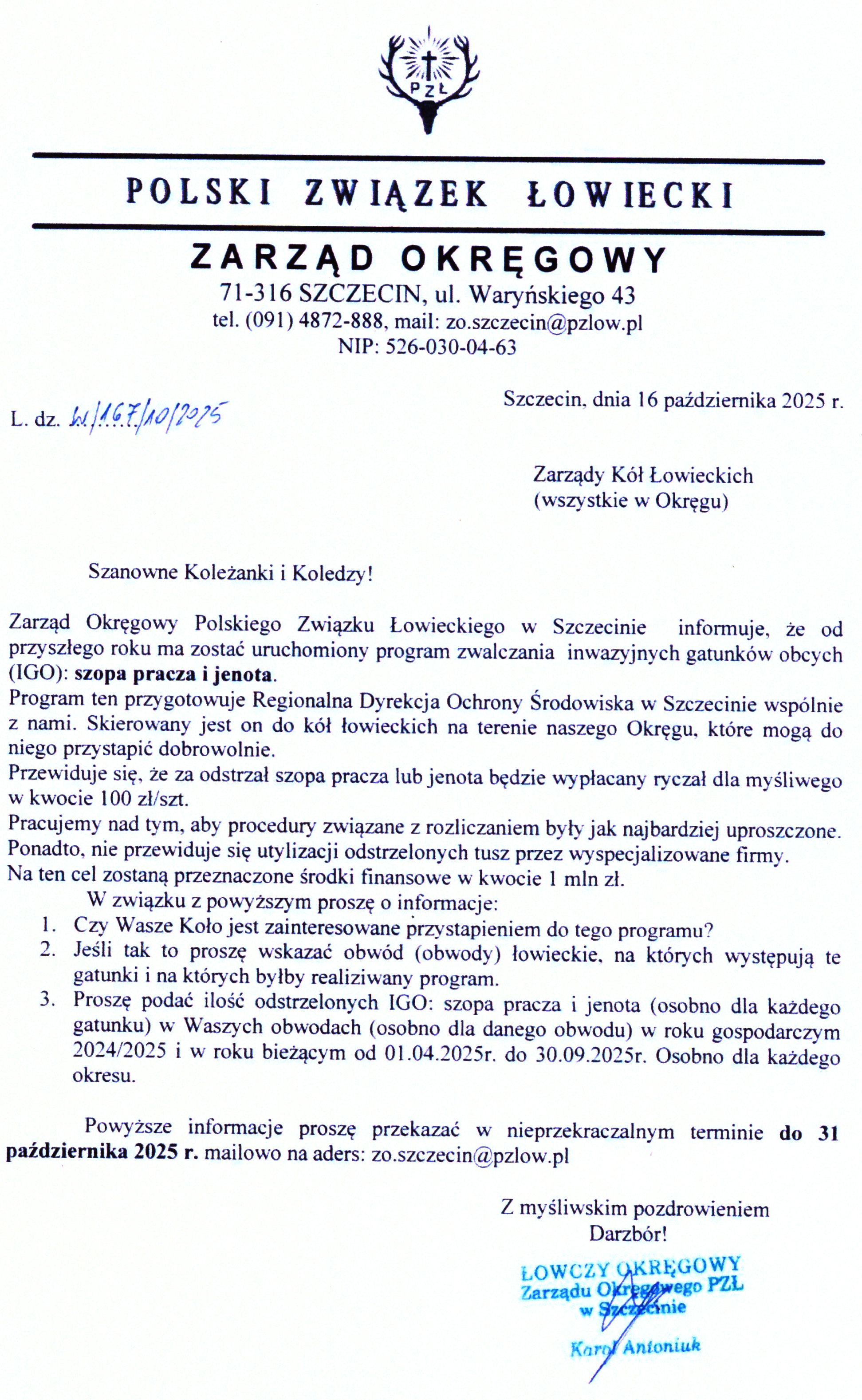 Zarząd Okręgowy Polskiego Związku Łowieckiego w Szczecinie informuje