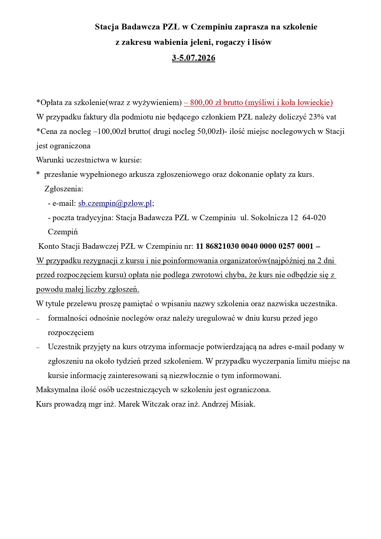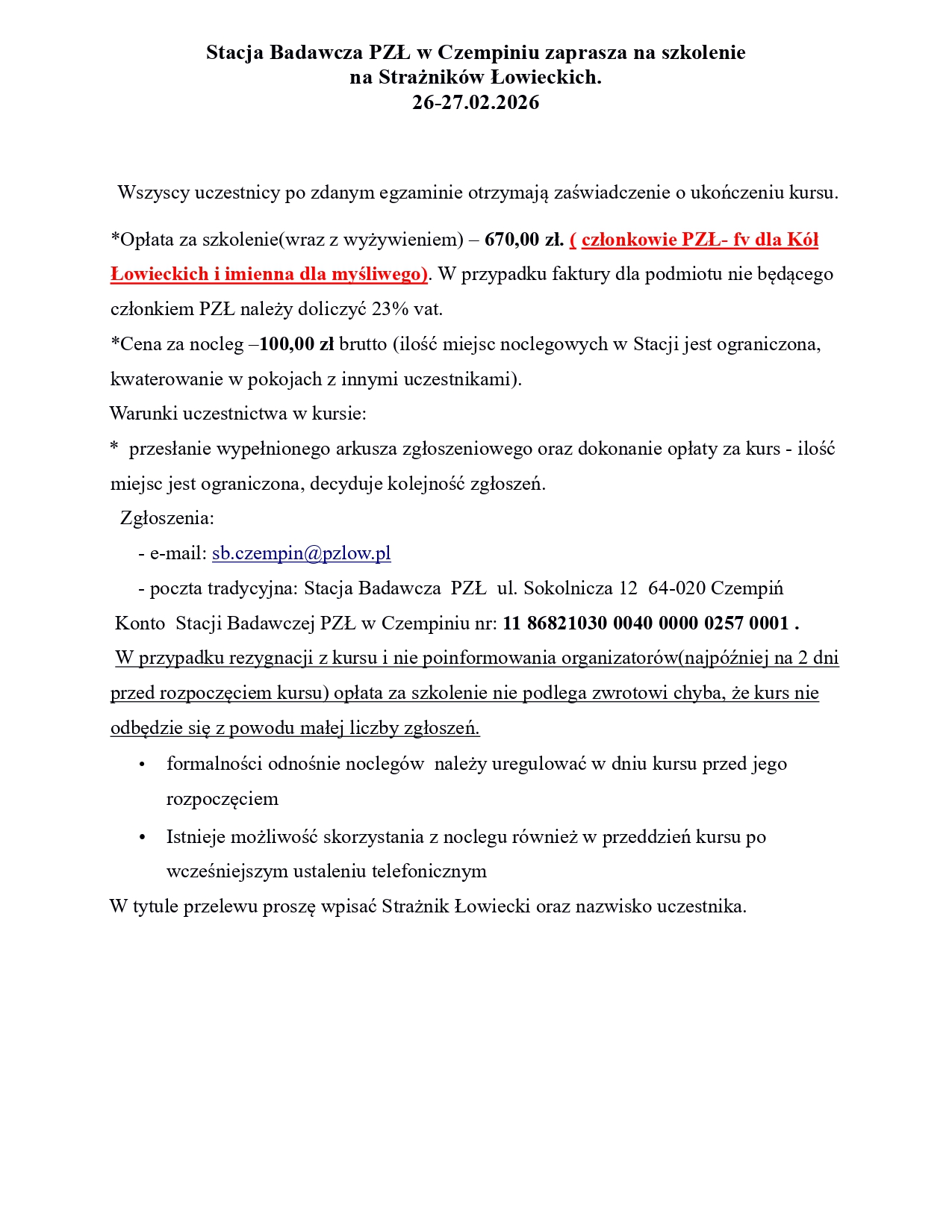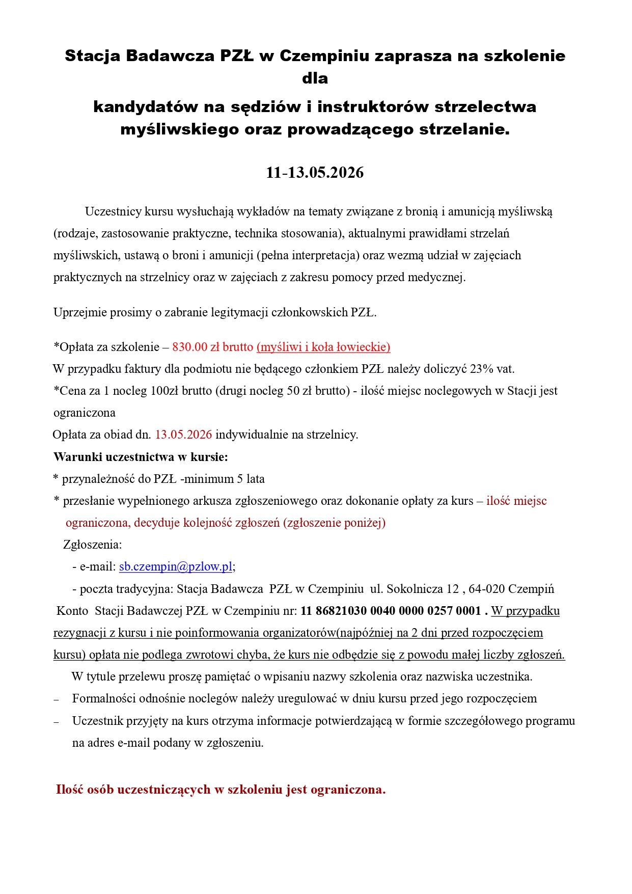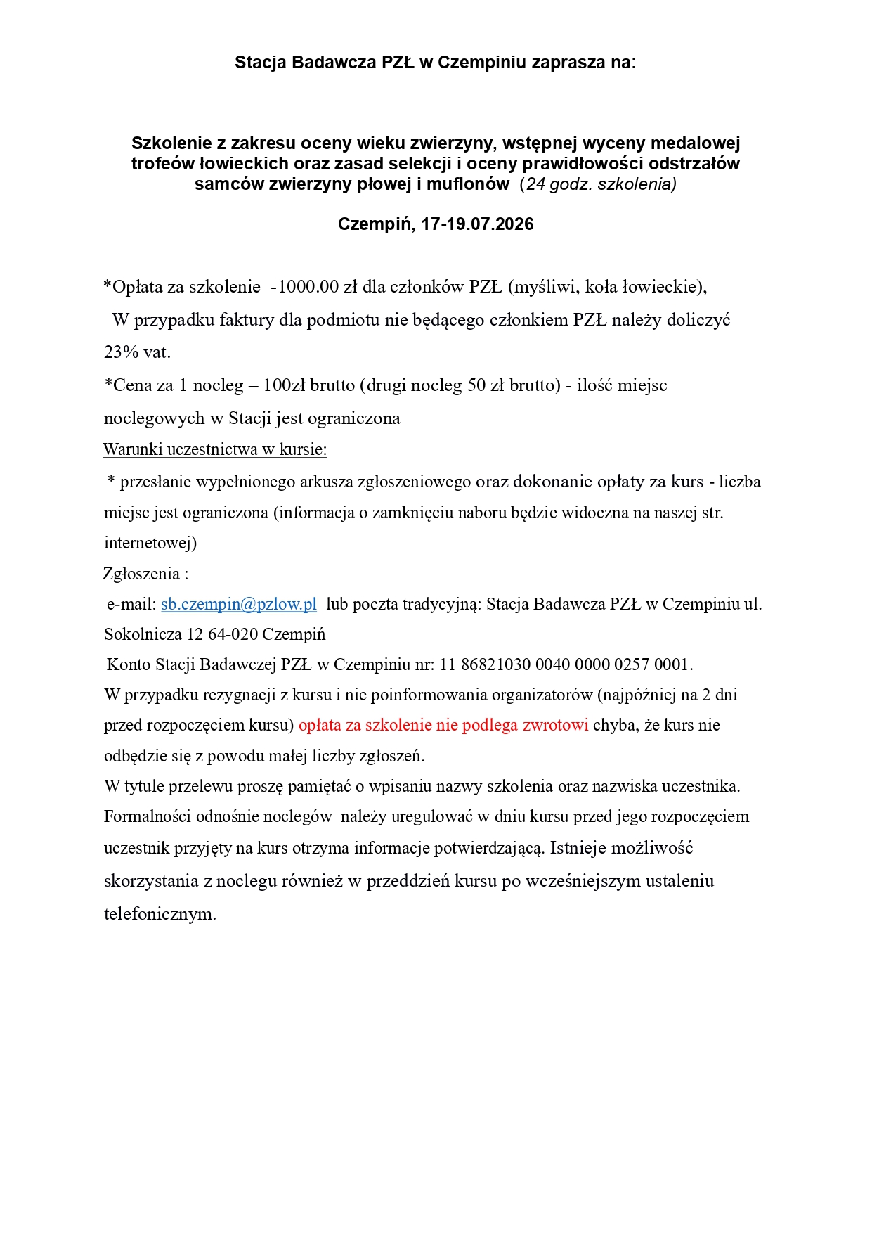 85 1240 3813 1111 0000 4375 6692 z adnotacją – opłata za kurs na uprawnienia selekcjonerskie - imię i nazwisko. Opłatę należy uiścić do 12 czerwca 2025 roku, potwierdzenie wpłaty z aktualnym numerem telefonu komórkowego oraz adresem
