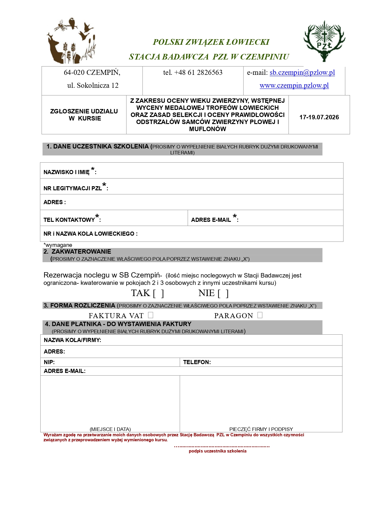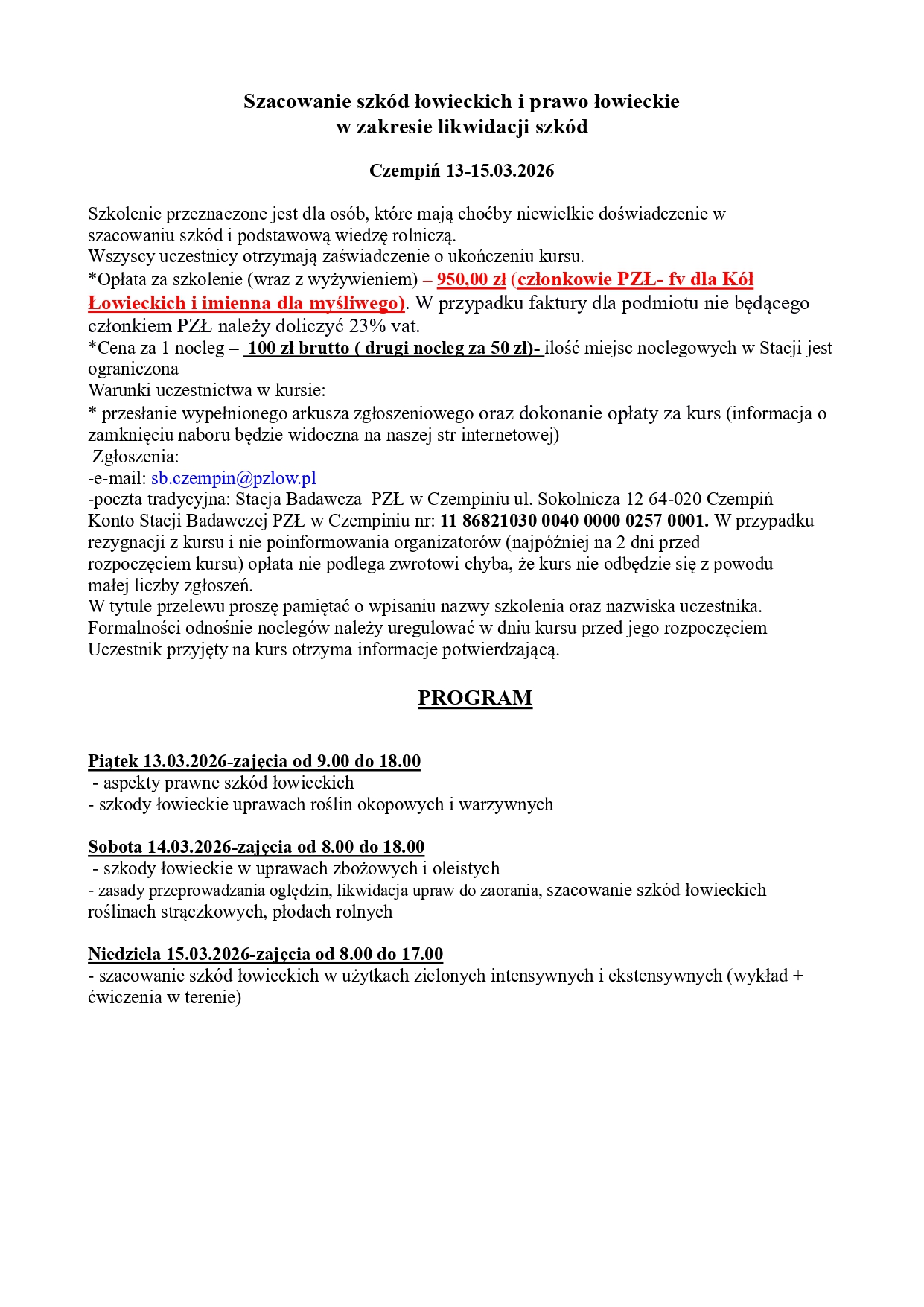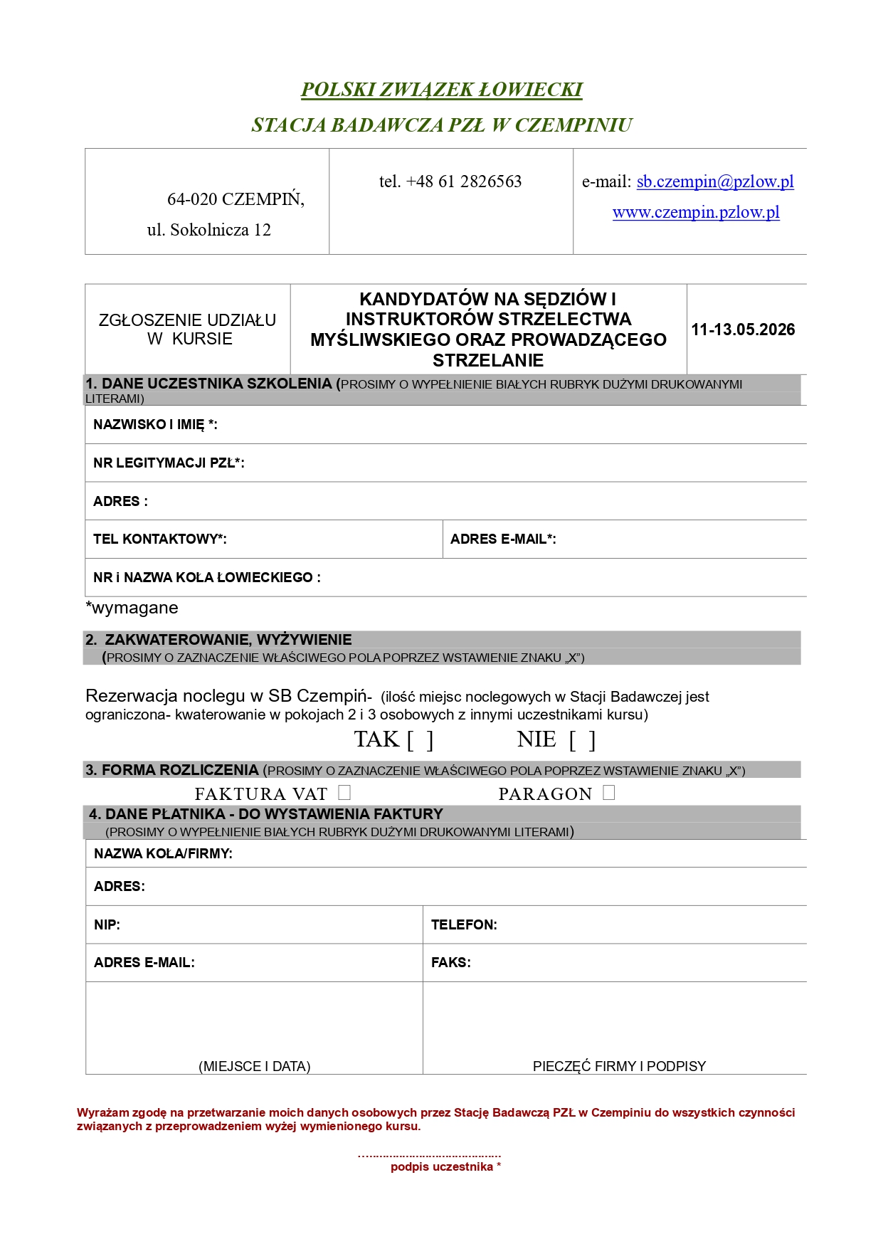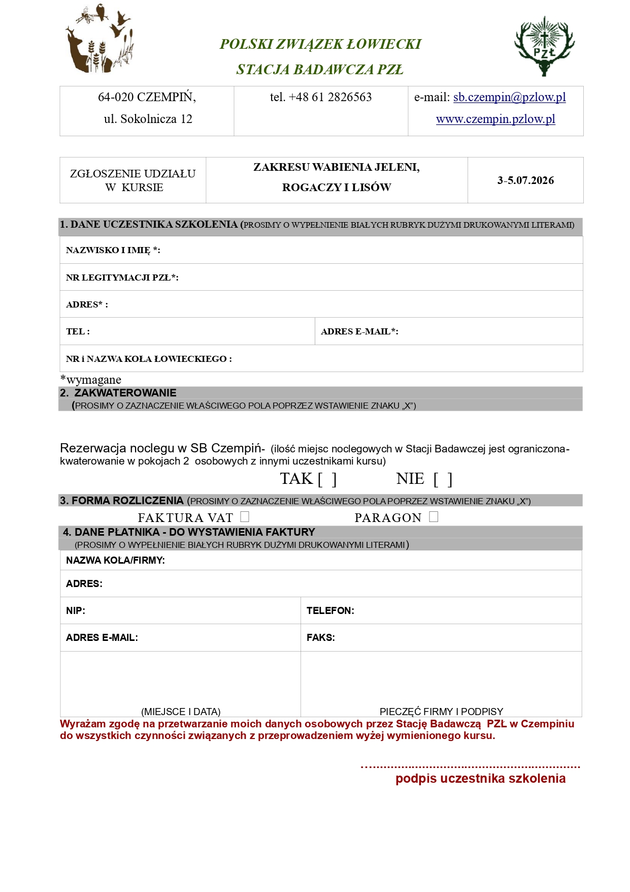 85 1240 3813 1111 0000 4375 6692 z adnotacją – opłata za kurs na uprawnienia selekcjonerskie - imię i nazwisko. Opłatę należy uiścić do 12 czerwca 2025 roku, potwierdzenie wpłaty z aktualnym numerem telefonu komórkowego oraz adresem
