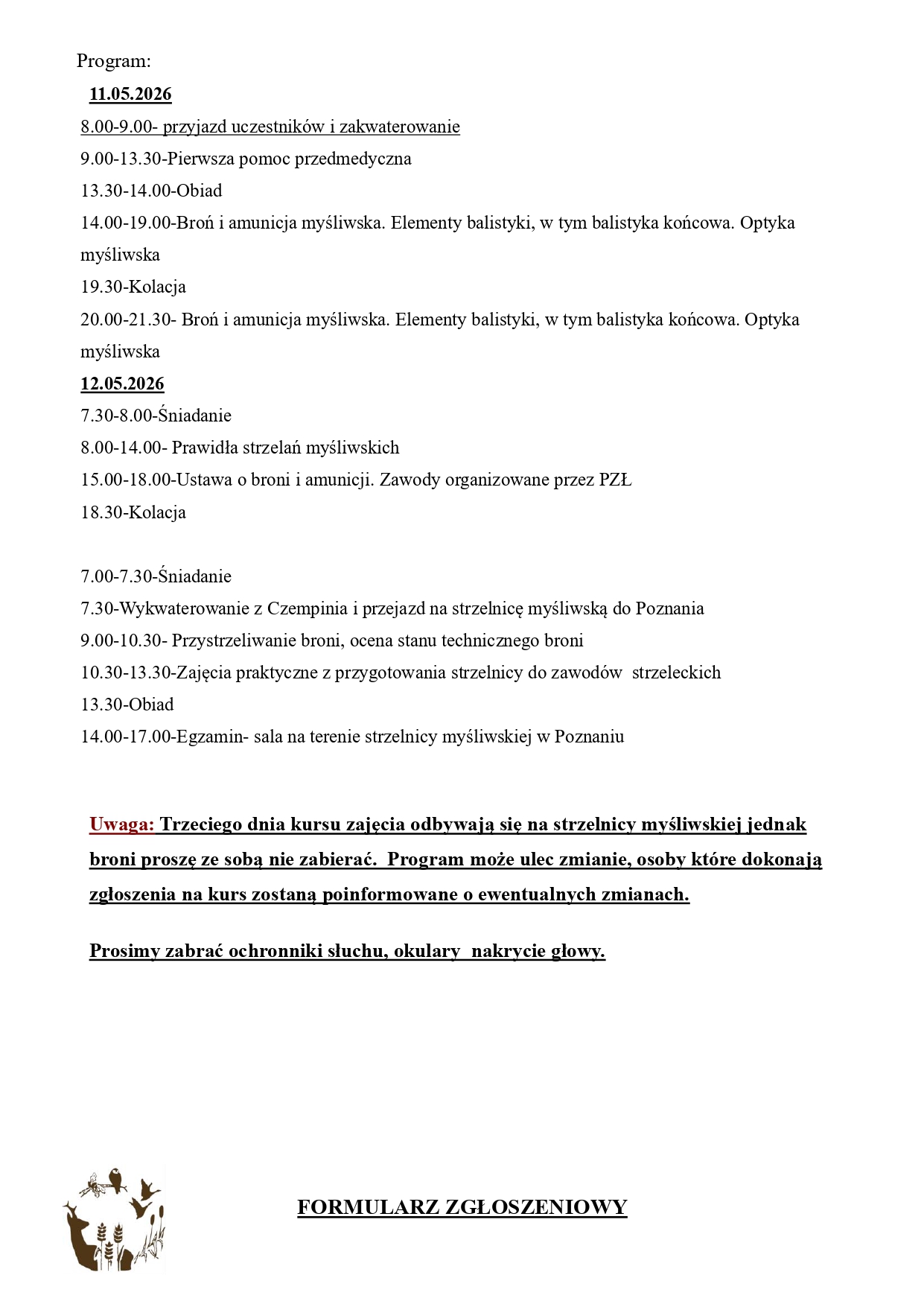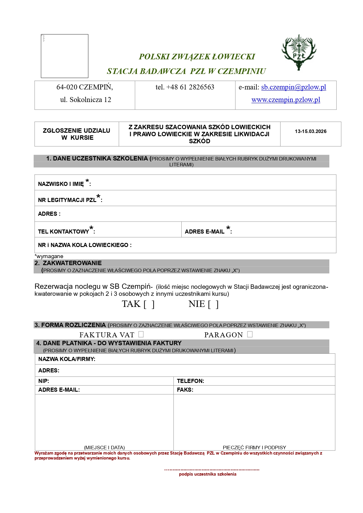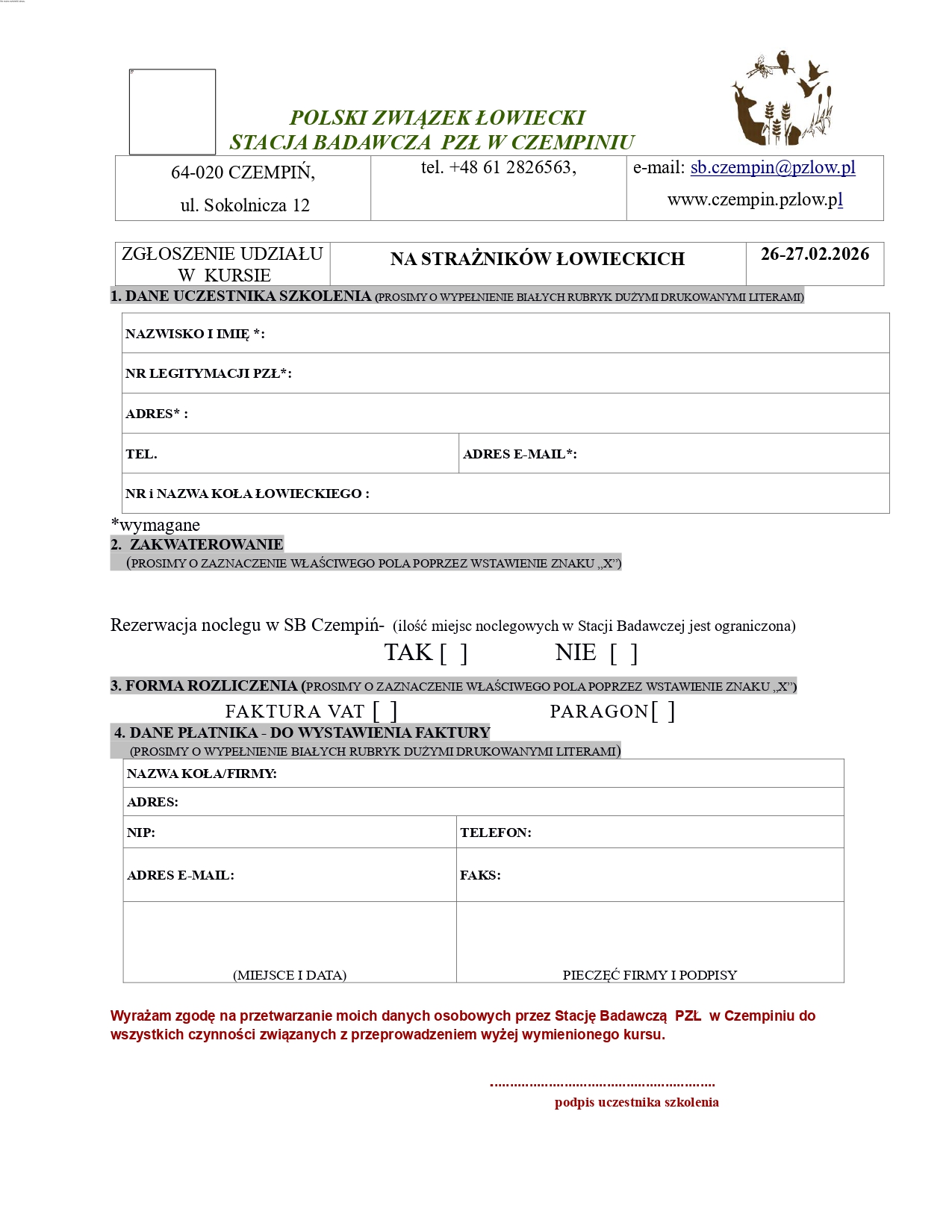 o organizacji kursu na uprawnienia selekcjonerskie do wykonywania polowania. Kurs rozpocznie się w dniu 14 czerwca 2025 roku. Wykłady będą prowadzone stacjonarnie w siedzibie ZO PZŁ w Szczecinie na ul. Waryńskiego 43. Nieodzownym warunkiem przystąpienia do szkolenia jest uiszczenie opłaty wysokości 800 zł brutto (osiemset) na numer rachunku bankowego Zarządu Okręgowego Polskiego Związku Łowieckiego w Szczecinie: